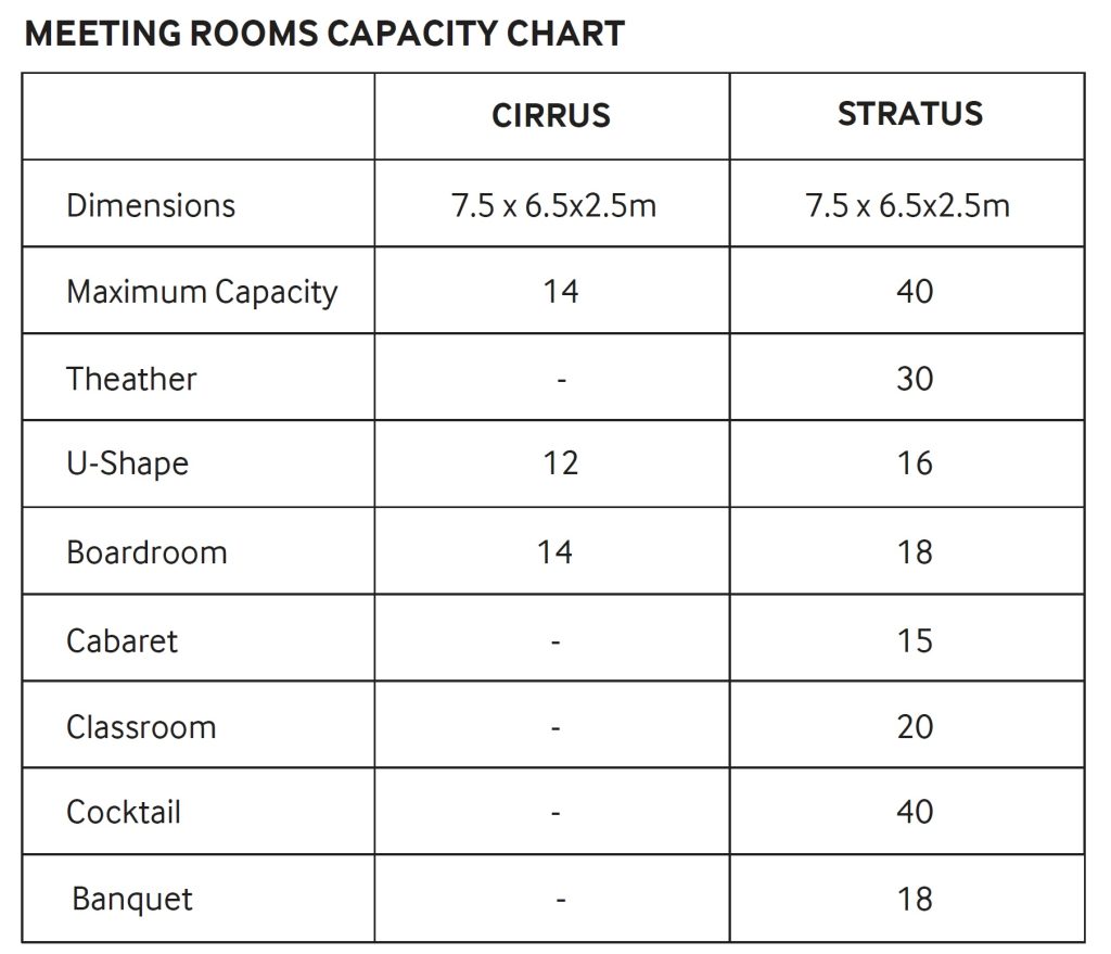 Cirrus meeting room offers a serene and focused environment perfect for executive discussions, strategic planning, and intimate gatherings. Its refined atmosphere encourages meaningful collaboration, making it an ideal choice for high-level conversations.