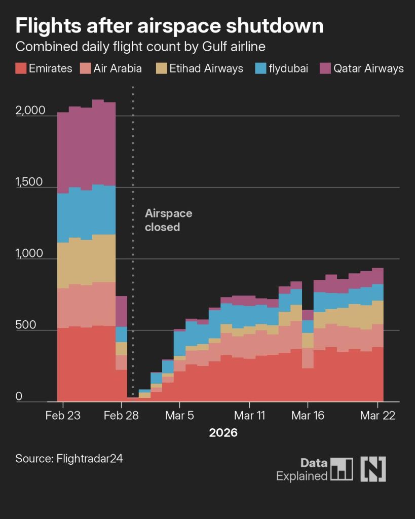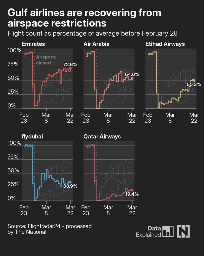 في أعقاب إغلاق المجال الجوي مباشرة، كان الاضطراب شديدا. خلال 48 ساعة، تم إلغاء آلاف الرحلات الجوية وتم إغلاق الممرات الإقليمية الرئيسية فعليا. في ذروتها في مارس، وصلت معدلات الإلغاء إلى حوالي 65٪ في أجزاء من الشرق الأوسط. بعد بضعة أسابيع فقط، تغيرت الصورة بشكل كبير. بحلول 23 مارس، انخفضت الإلغاءات إلى حوالي 13٪، مع بدء نشاط الرحلات في التجدد.